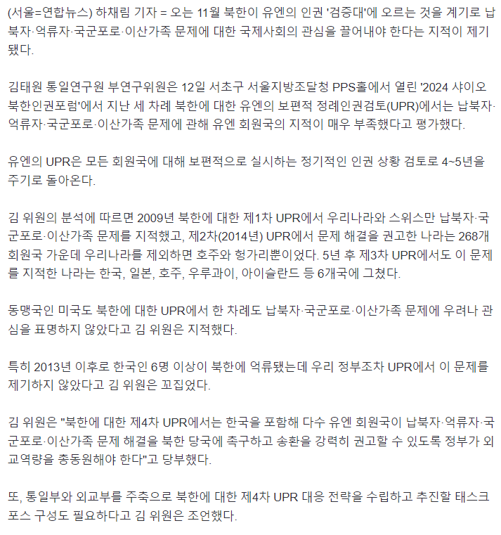 "납북·억류·이산가족에 UN회원국 관심부족…정부전략 필요"
